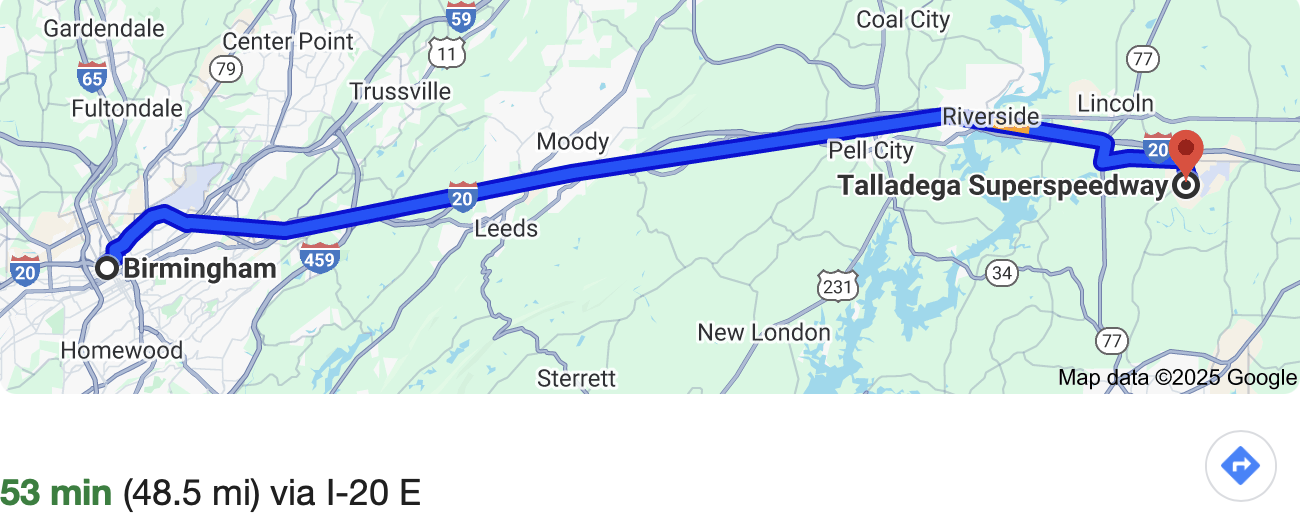 Unacceptable. I stood there, fully ready, thinking about the day before, when I had spent 2.5 hours to see about 25 minutes of NASCAR Racing at Talledega, covered in yesterday’s missive. All ready to go, and having already memorized the new path to Starkville via Jasper, AL, it seemed painful to choose an adjustment. But I thought of the Radley’s decision to go to the Rhine, and I thought, “hell, it can’t be that far.” In fact, it was an 11 minute adjustment. So, off I went to search of Rickwood.