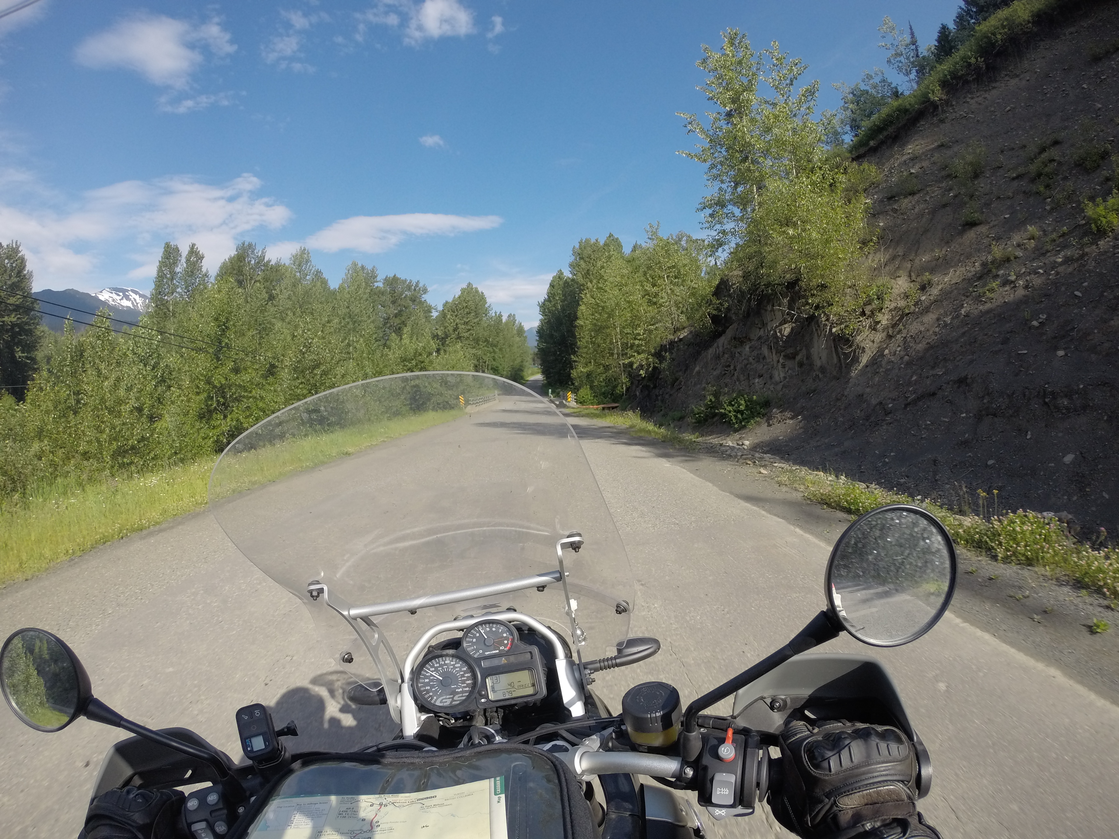 The Cassiar is exceptional. Almost nothing there – a corridor of green and narrow. Beautiful vistas and an ever narrowing, less traveled road. It may be hell on tires, but it grips like crazy for motorcycles, and through Dease Lake, anyway, it’s been safe and a blast to ride.
