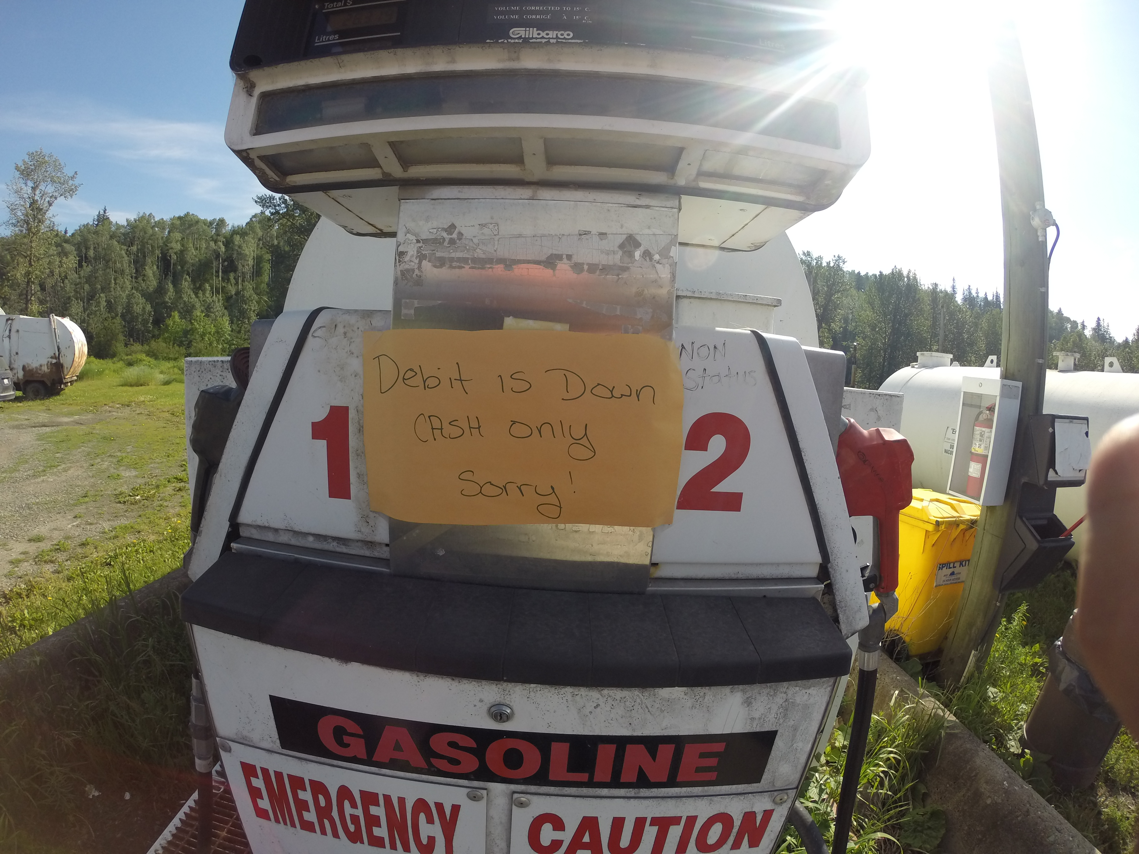 Most of the day was spend on the remote Cassiar Highway, a relatively newly-paved standard that gets narrower and rougher as we head north. Our first stop on the Cassiar was Gitanyow, the last gas headed north for 135 miles on an Indian reservation. Note that at the pump, we are non-status, and welcome to use Pump #2.