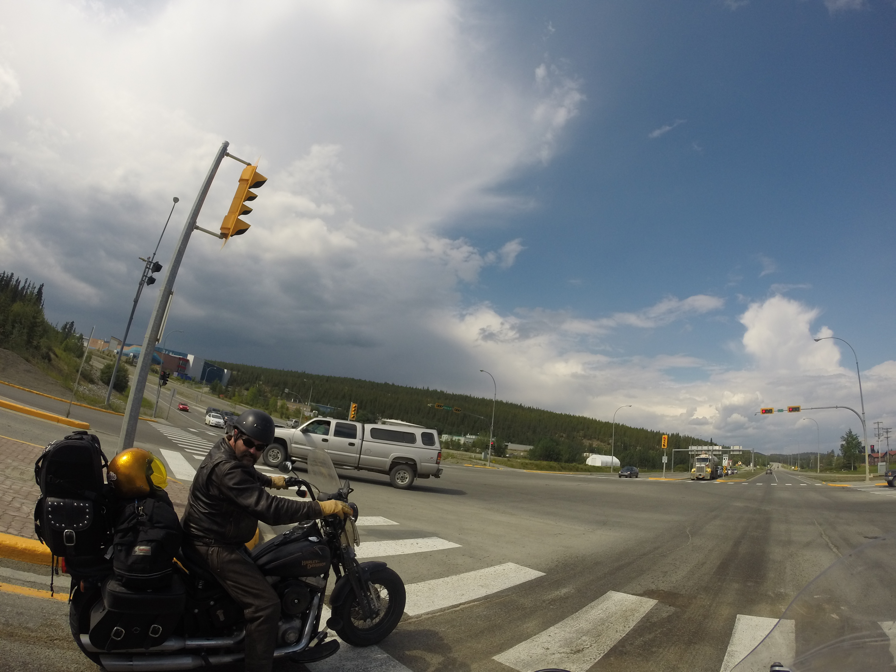 It was calm and clear and beautiful to the relatively large town of Whitehorse. By that time, we were looking for pie, and all we found was gas. The skies were bright blue and all was well until we hit the longest light in the world. I know you all feel like YOU have hit that light somewhere. But I swear to you, it was 5 minutes long and every other direction, including our left hand turn lanes and each of the other 3 entry points each went TWICE. Annnyway…