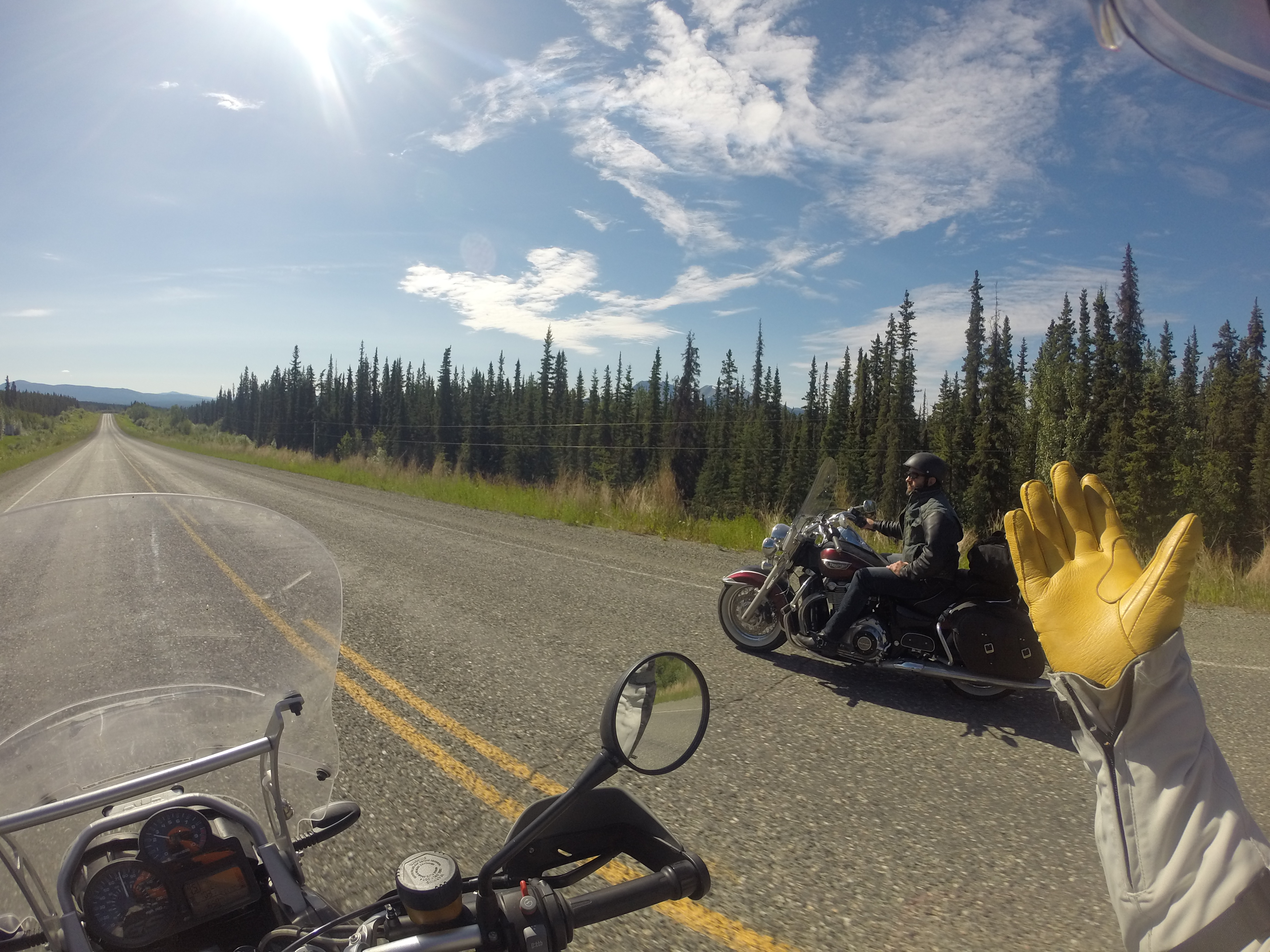 We broke from Teslin wanting to take extra photos of the huge lake and spectacular vistas that we saw entering town the night before. Charlie went straight to the overlook. Doug and I took the Great Circle route, perhaps because we wanted to further honor the far north, and perhaps because we failed to see Charlie waving madly from the Rest Area. He was never scared…, he knew we would come back. In the fabled words of Todd Snider at the Devil’s Backbone Tavern, “so we did!”