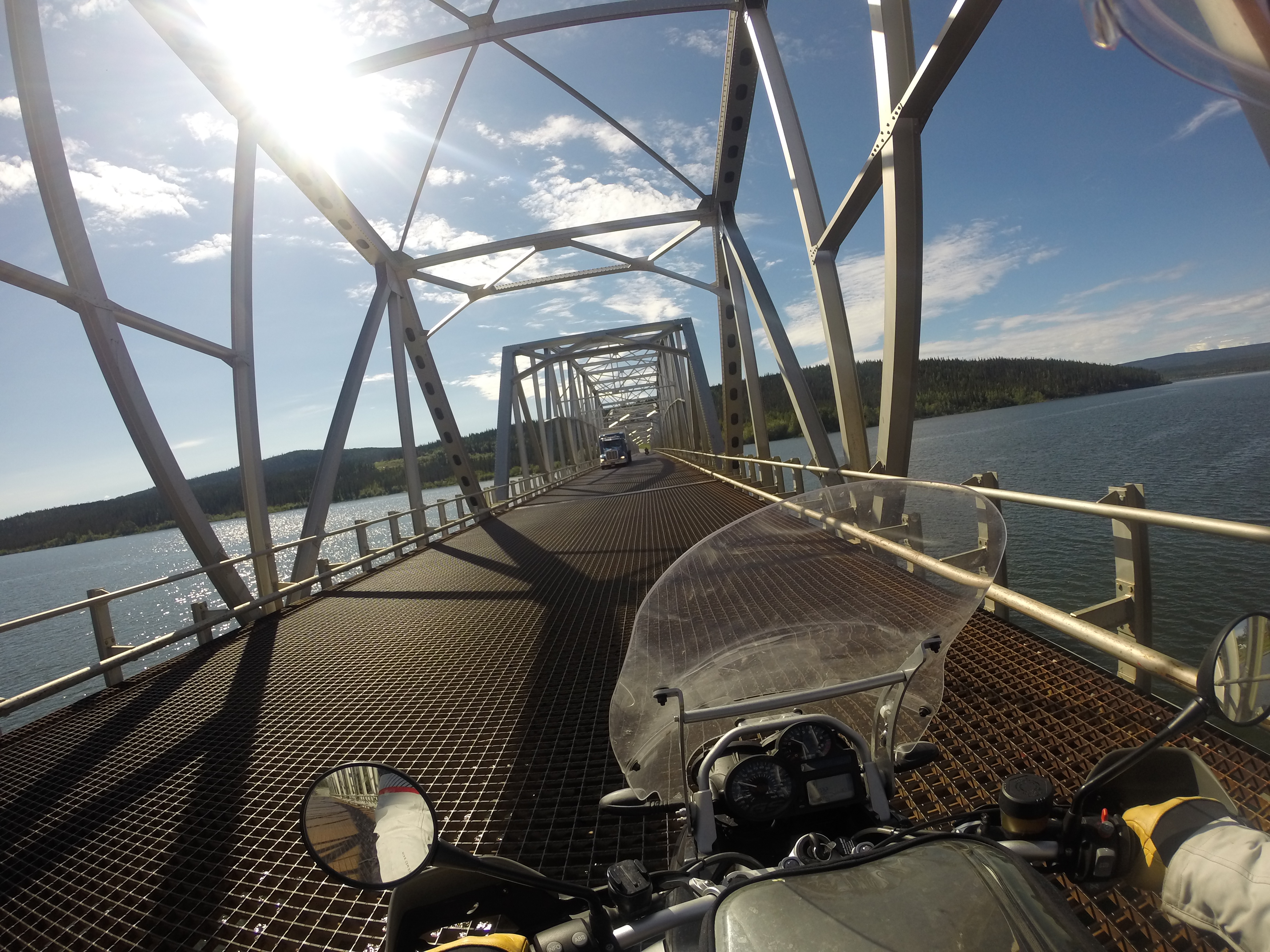 More gas, then about 20 miles (30 clicks, I’ll be glad to be done with kilometers, but not with 80-cent dollars) of pilot-car, dusty, truck-filled, dusty, slippery, dusty gravel. Pleah. AND there was one helluva ski-jump that we all hit. All day long there were signs about frost heaves that were little more than little bumps and rollers. We came around a corner, and six feet across with an 8 inch lip/launch. Charlie’s Harley actually left the ground completely at about 70 mph. I was able to move right 2 feet and catch a smaller lip and big bump. Doug hit it square, and I have no idea if he lifted off. We all were fine, but more than a little adrenalized by Charlie’s leap. We had no sore asses before the jump — and three after.