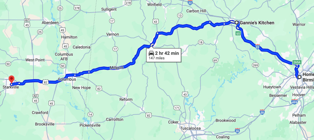 Onward. I took a northern route – 35 miles more on an interstate – 22 in this case, toward Jasper to the aptly named home of Gannie’s Kitchen.